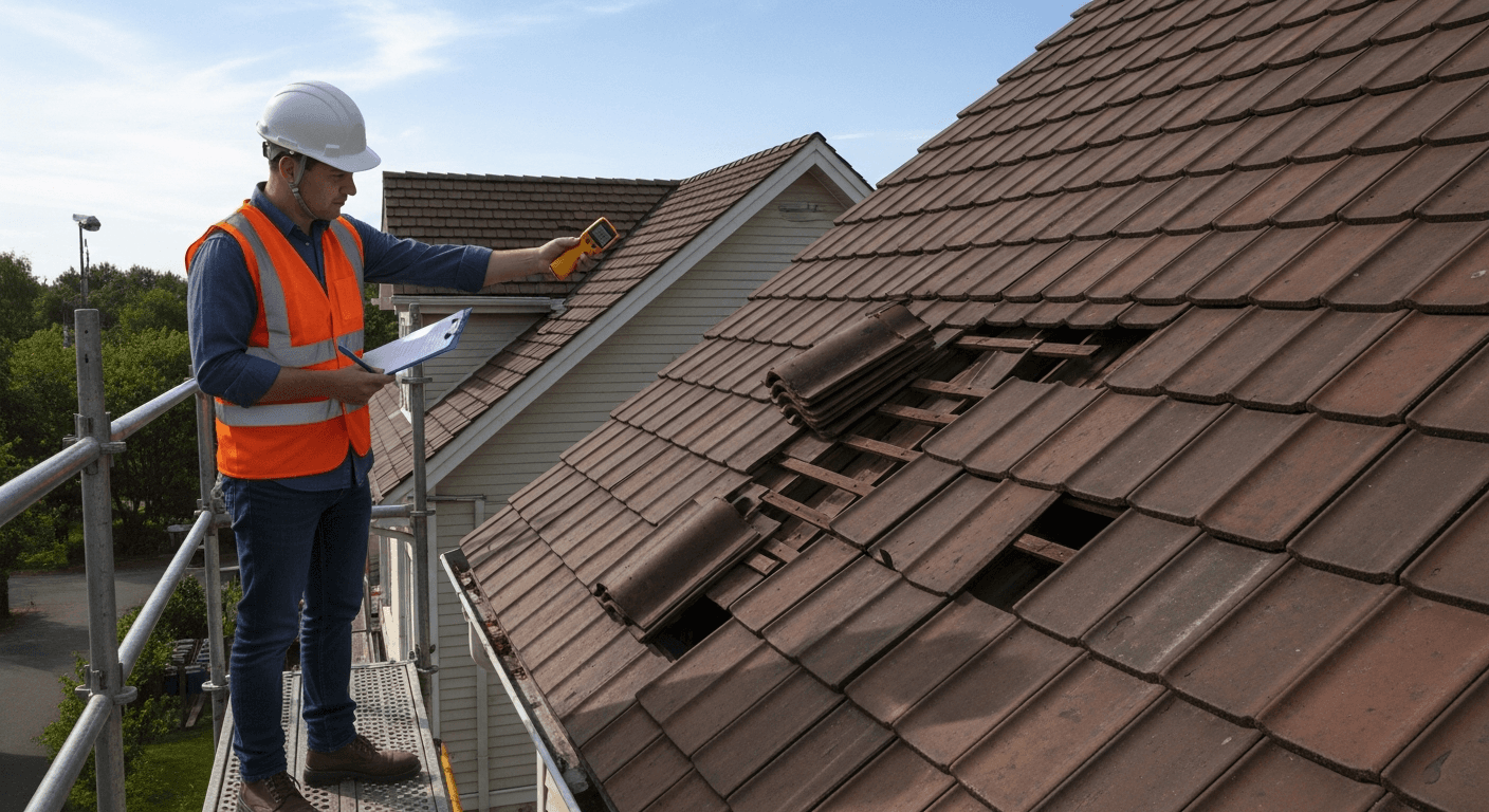Der Sachverständige besichtigt das Dach, dokumentiert den Zustand fotografisch und nimmt bei Bedarf Messungen vor (Feuchte, Temperaturen, Maße).